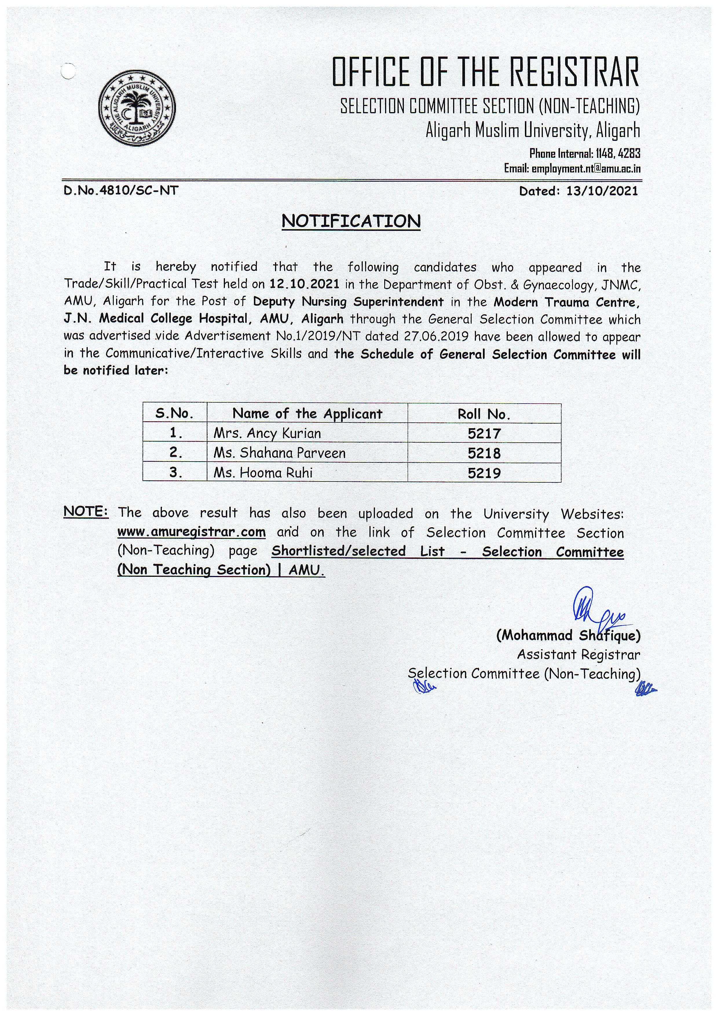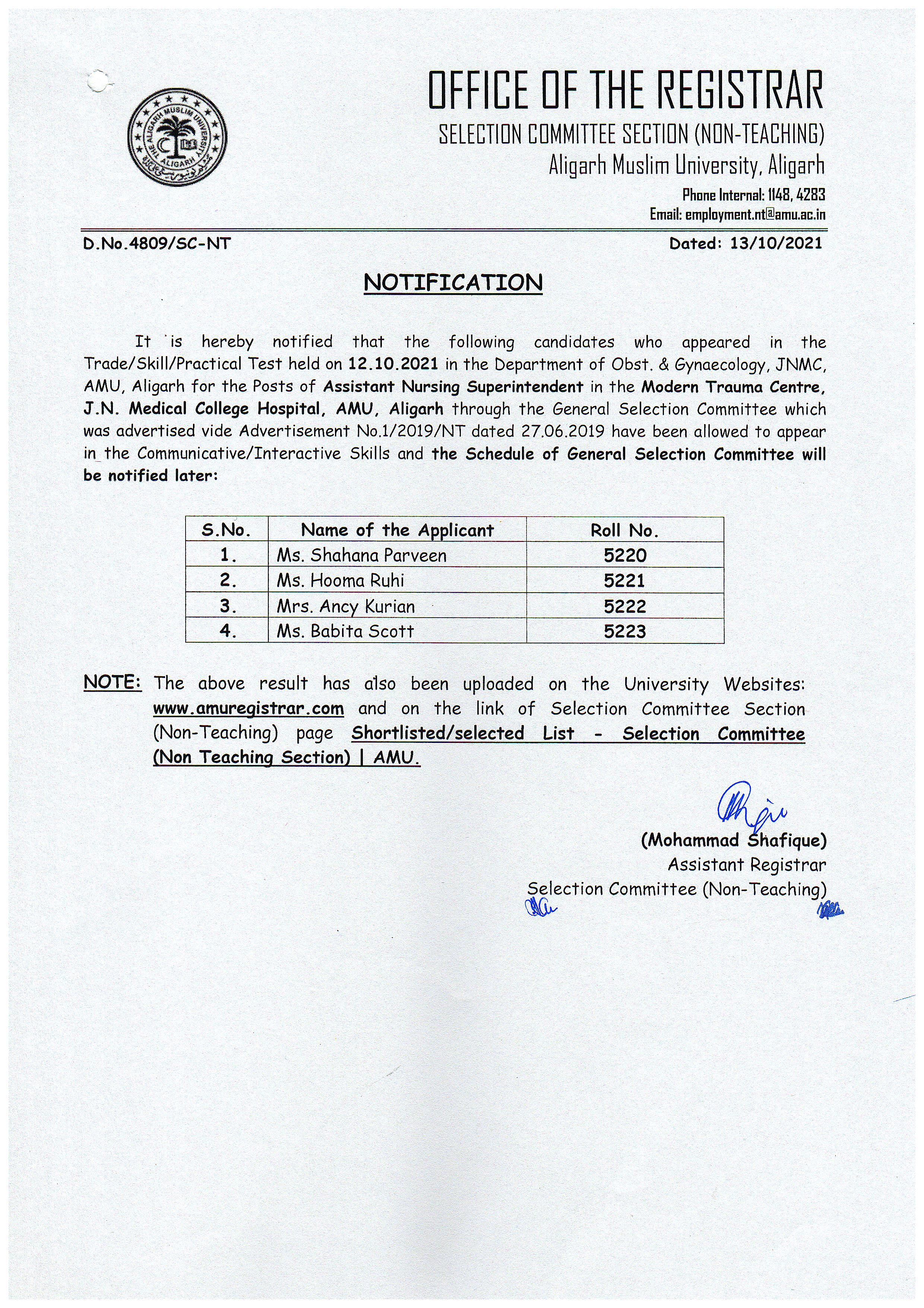 - Result of Trade/Skill/Practical Test for the post of Assistant Nursing Superintendent in the Modern Trauma Centre,JNMCH,AMU,Aligarh through General Selection Committee.