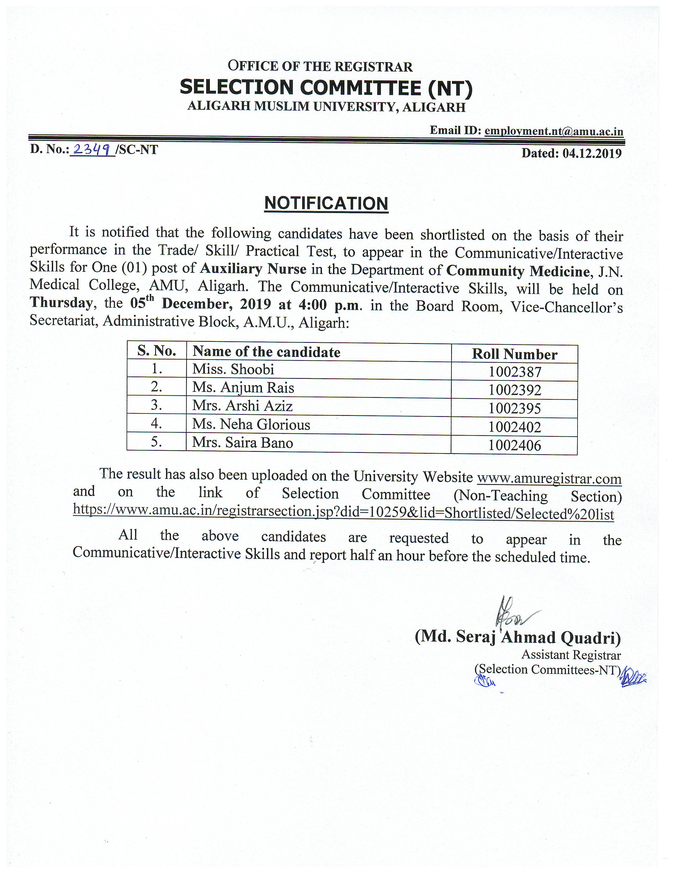 - Candidates Shortlisted for Auxiliary Nurse in the Department of Community Medicine,JNMC,AMU Aligarh.