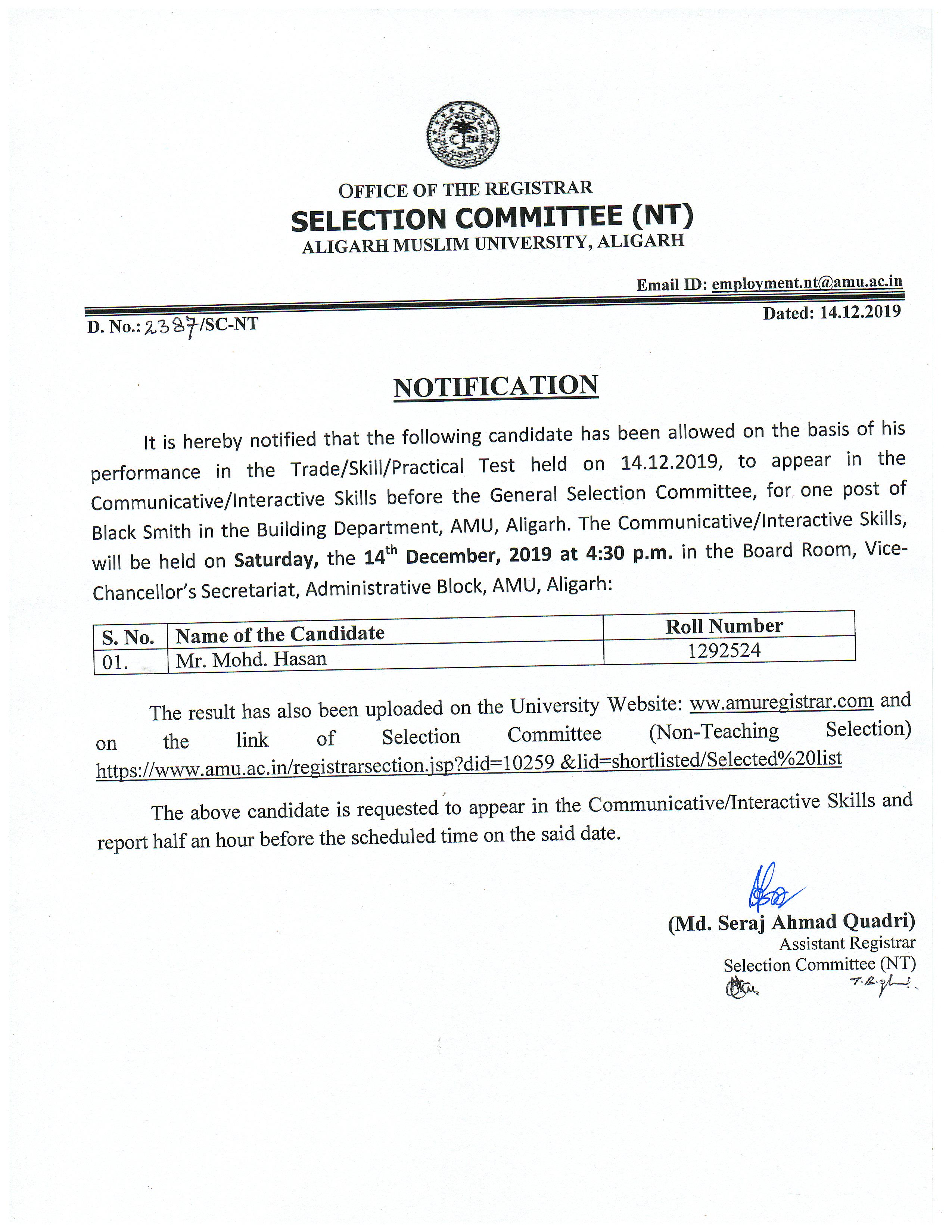 - Result of Trade/Skill/Practical Test for the post of Senior Binder in the Maulana Azad Library,AMU Aligarh through General Selection Committee.