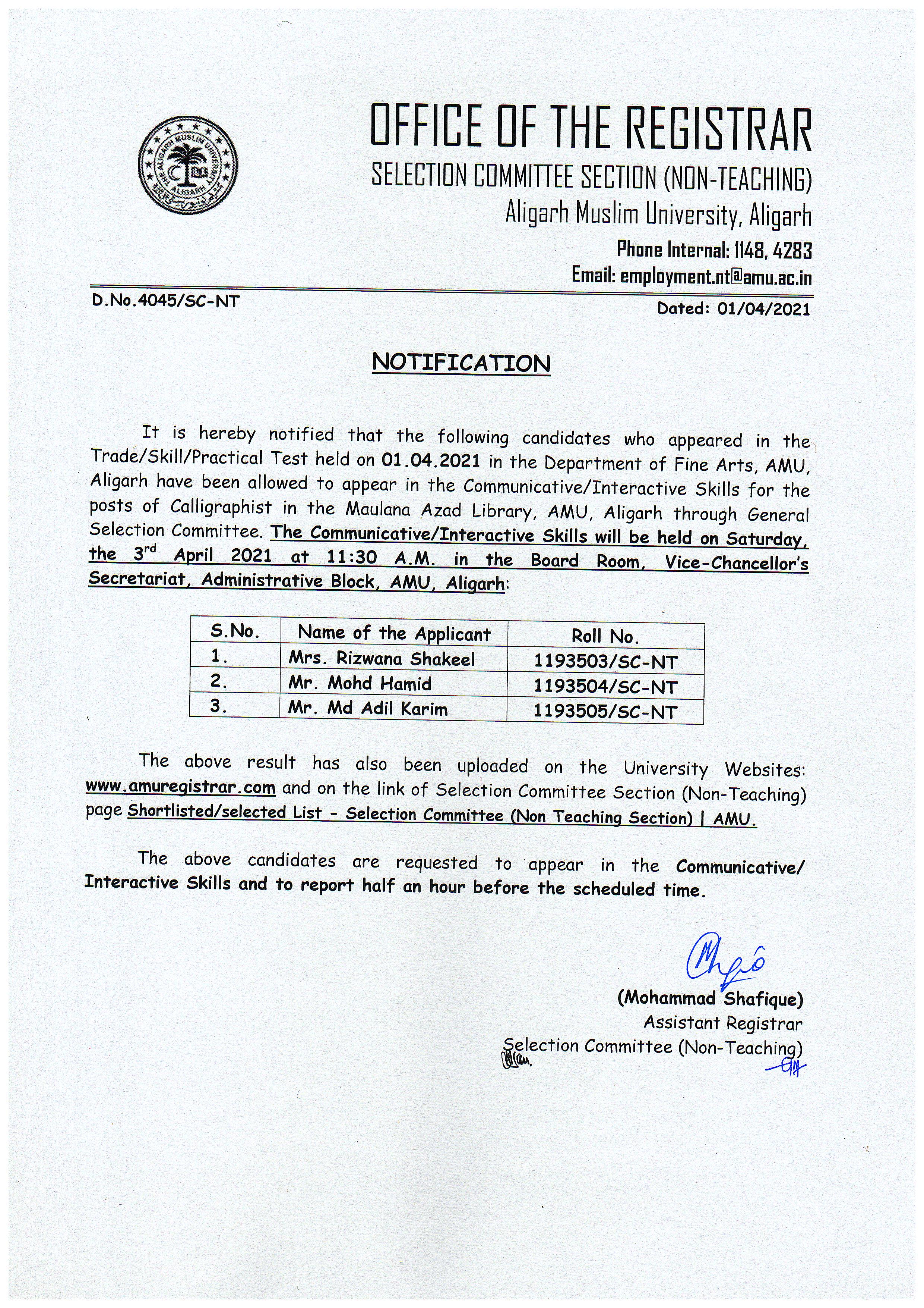 - Result of Trade/Skill/Practical Test for the post of Calligraphist in the Maulana Azad Library,AMU Aligarh through General Selection Committee.