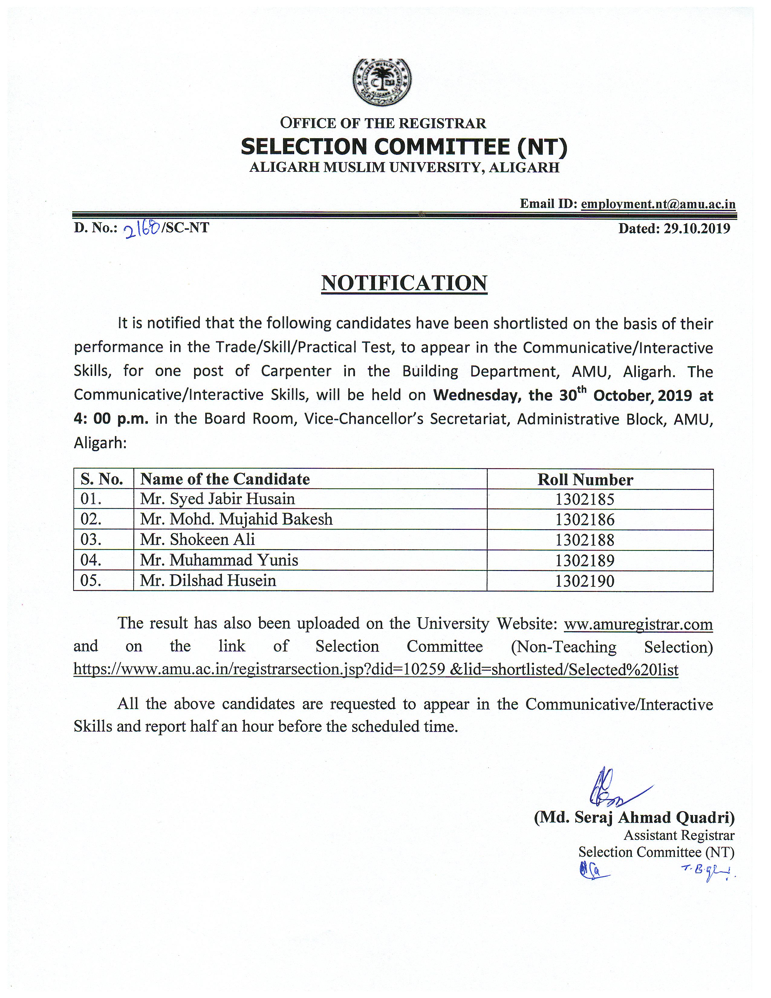 - Candidates Shortlisted for Carpenter Building Department,AMU Aligarh.