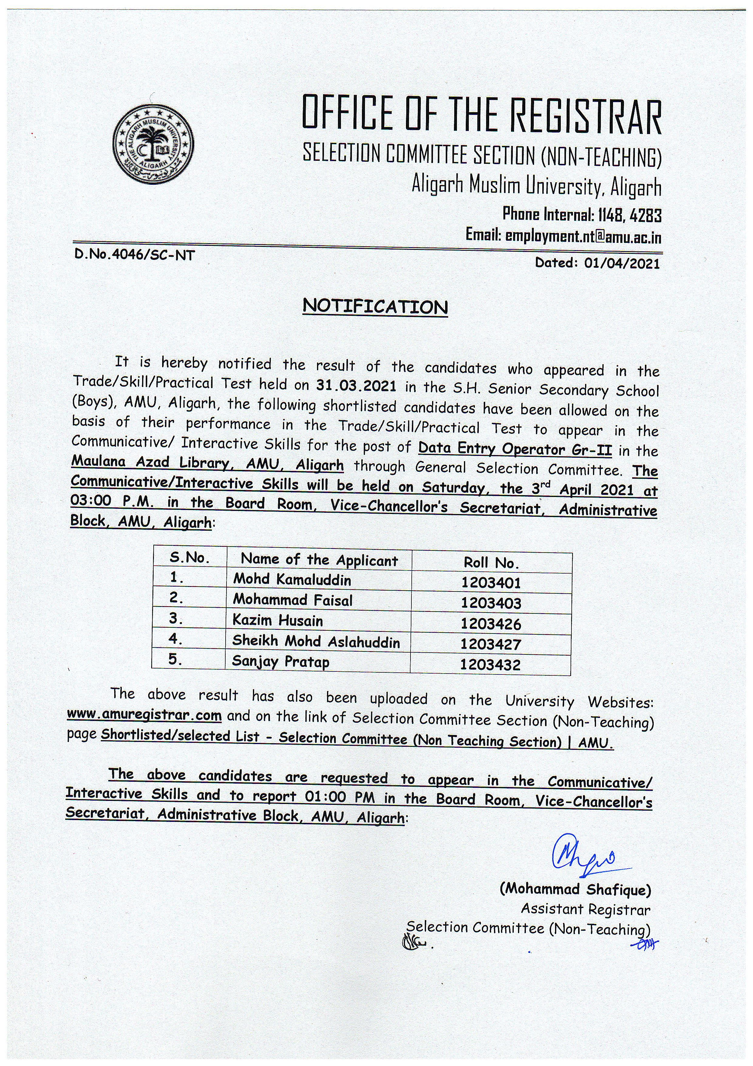 - Result of Trade/Skill/Practical Test for the post of Data Entry Operator Gr-II in the Maulana Azad Library,AMU Aligarh through General Selection Committee.