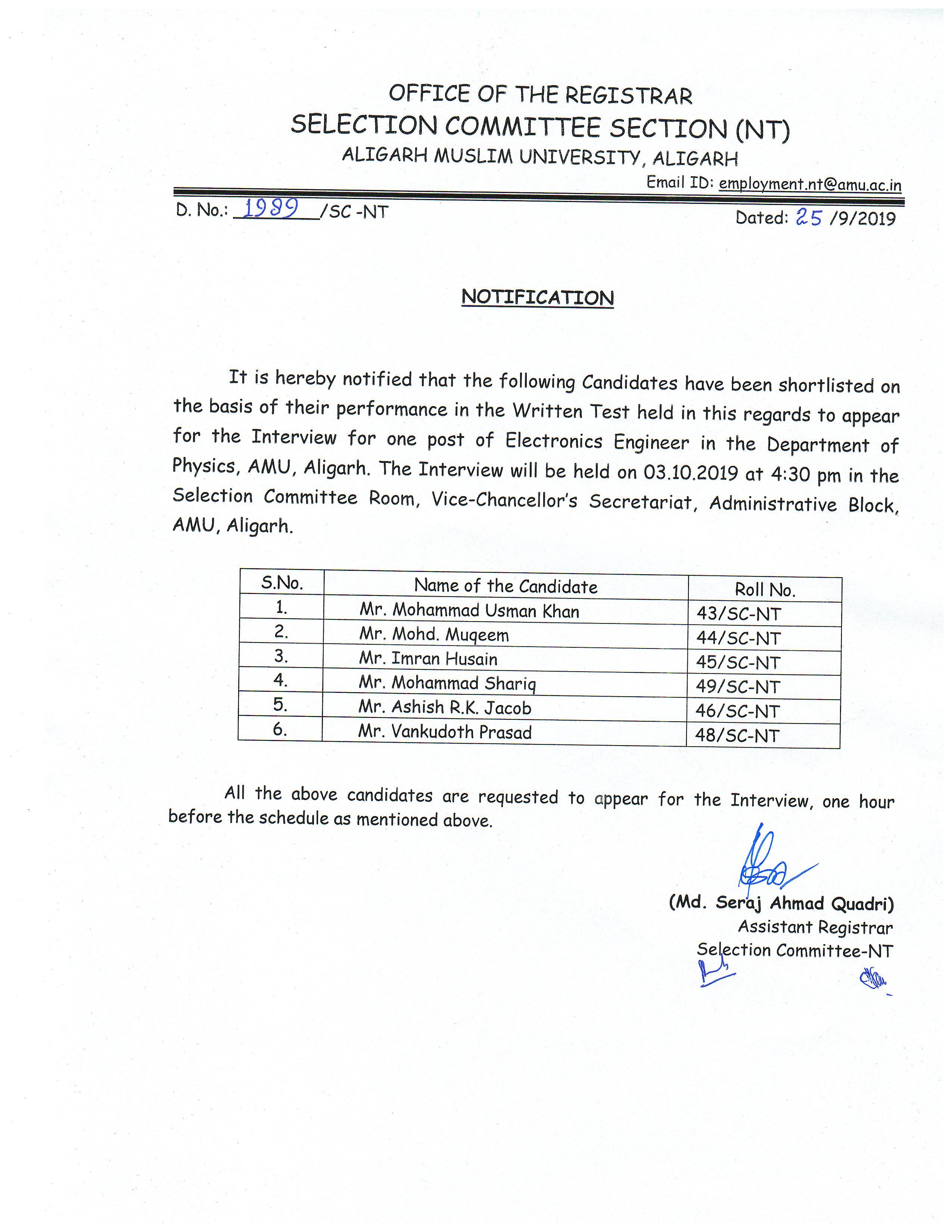 - Candidates Shortlisted for Electronics Engineer,Department of Physics,AMU,Aligarh
