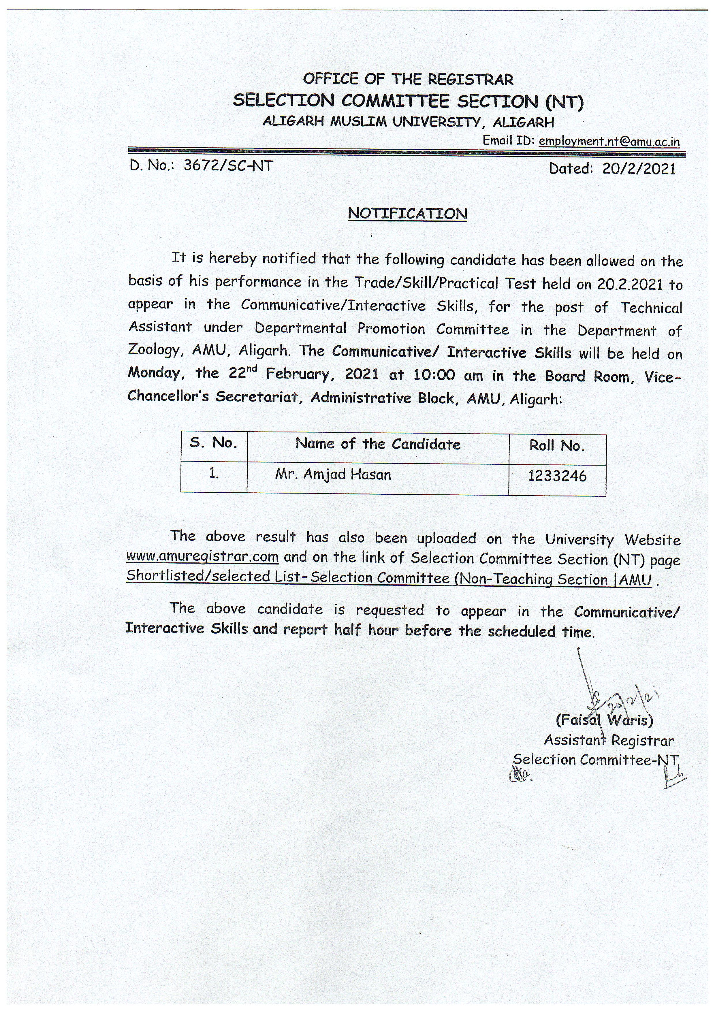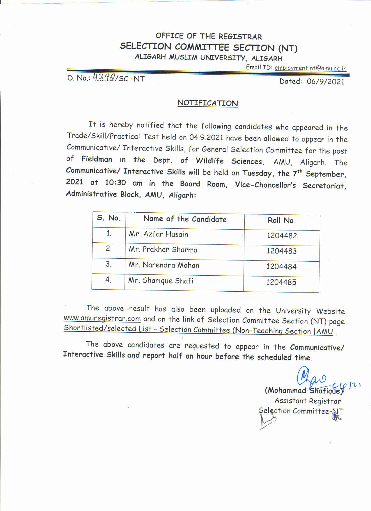 - Result of Communicative/Interactive Skill Test for the post of Fieldman in the Department of Wildlife Science through General Selection Committee ,AMU Aligarh.