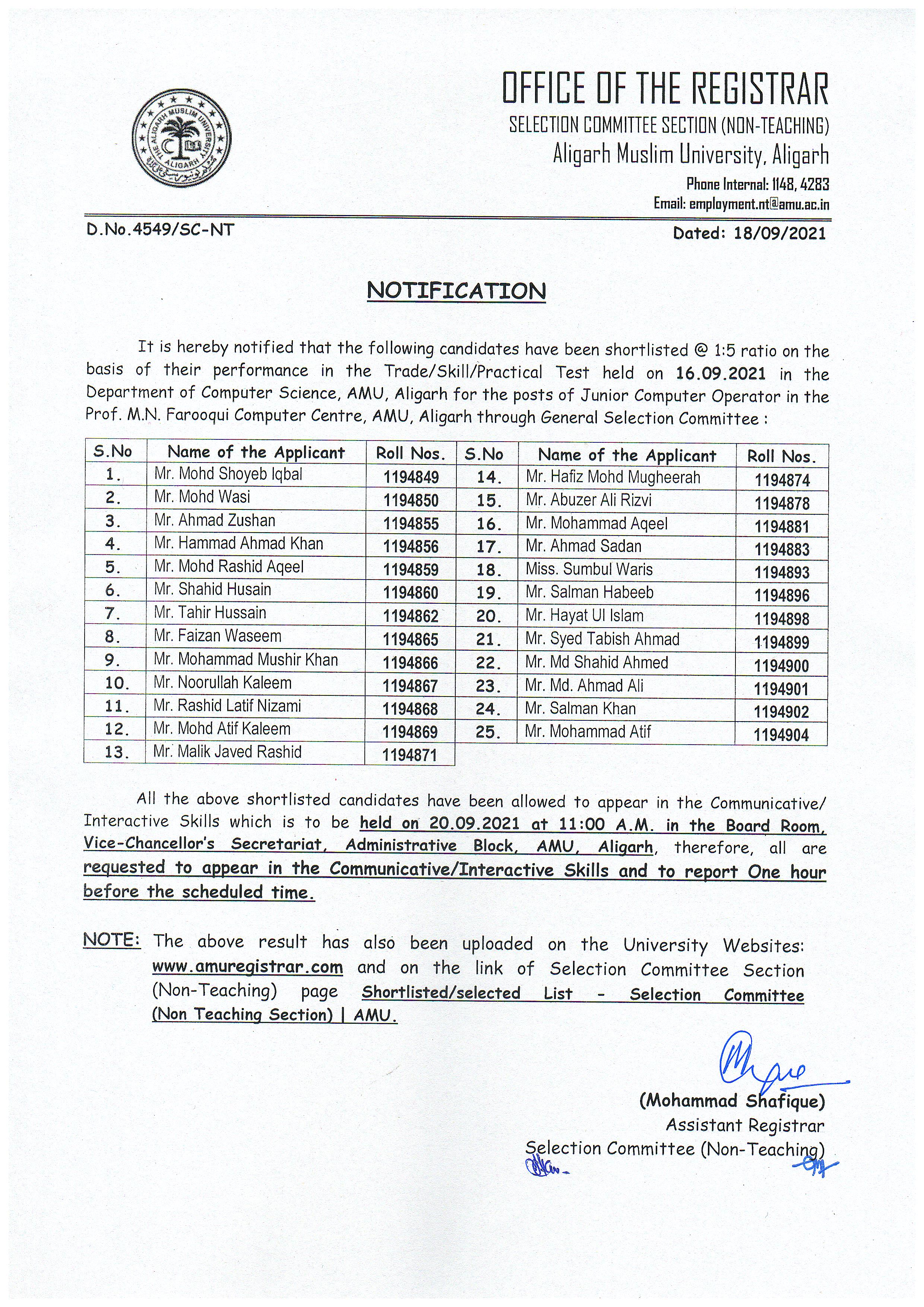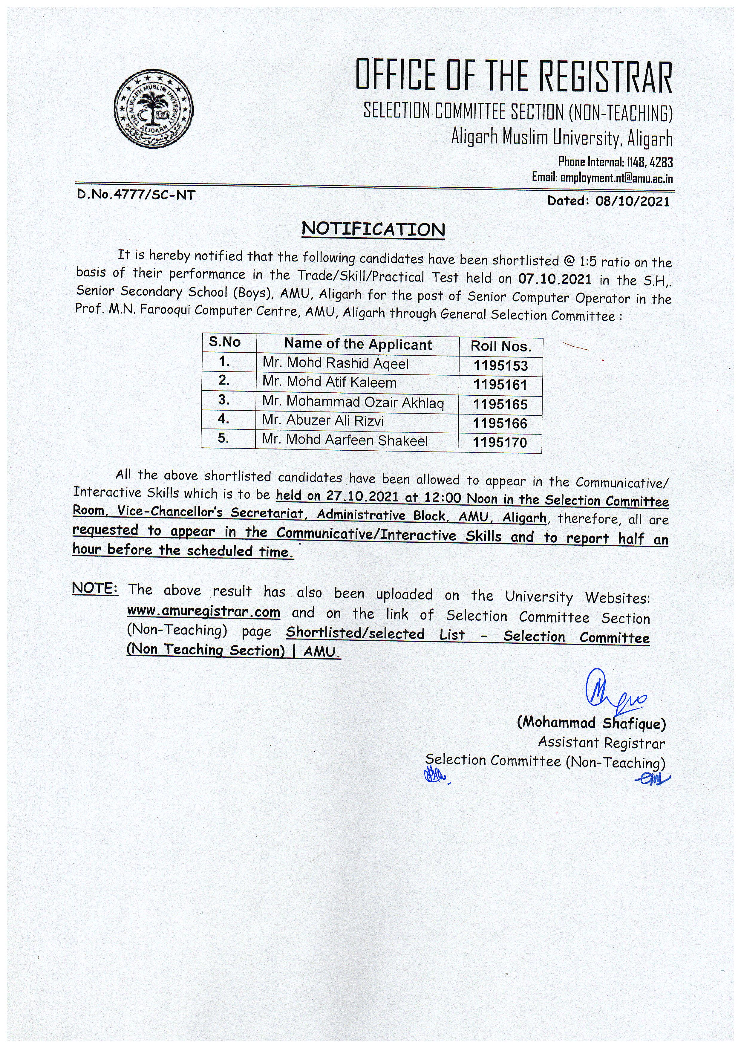 - Result of Trade/Skill/Practical Test for the post of Senior Computer Operator in the Prof M.N Farooqui,Computer Centre,AMU,Aligarh through General Selection Committee.