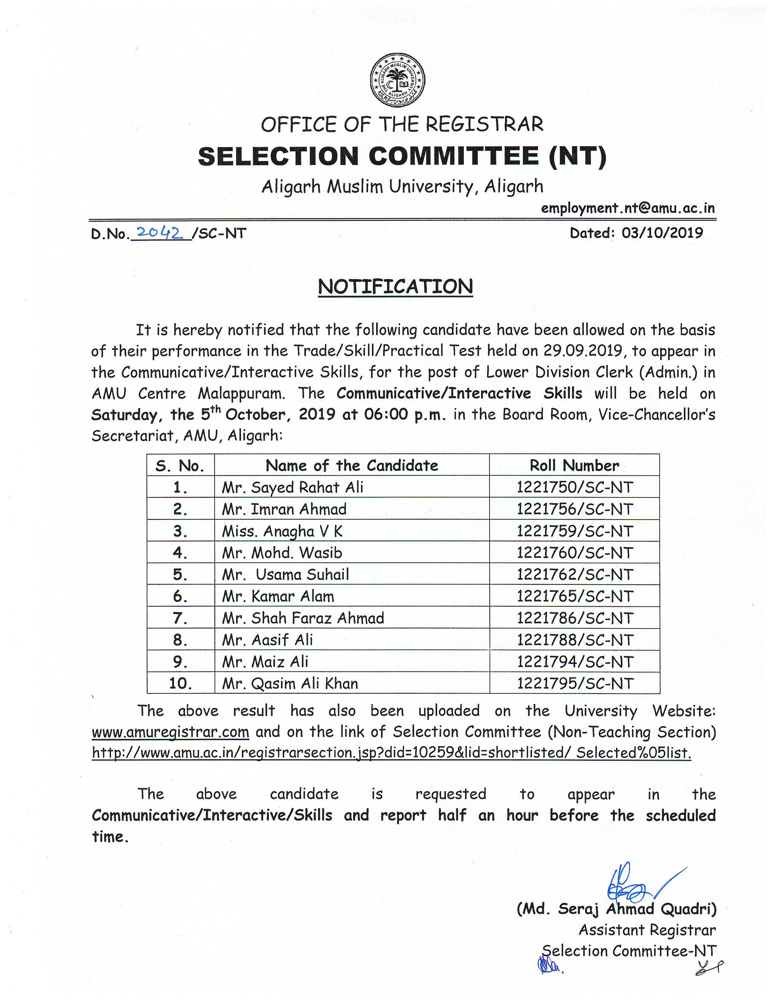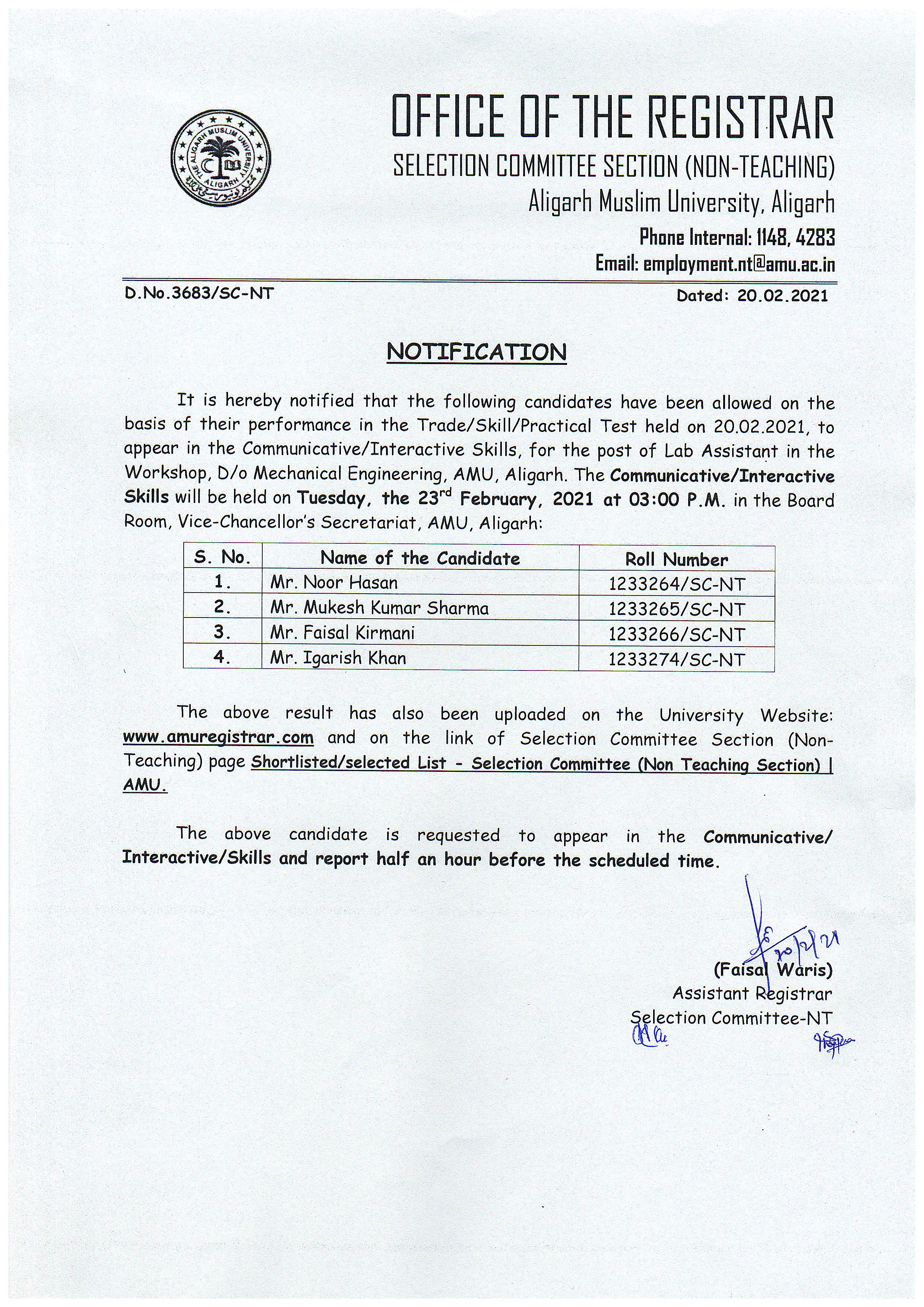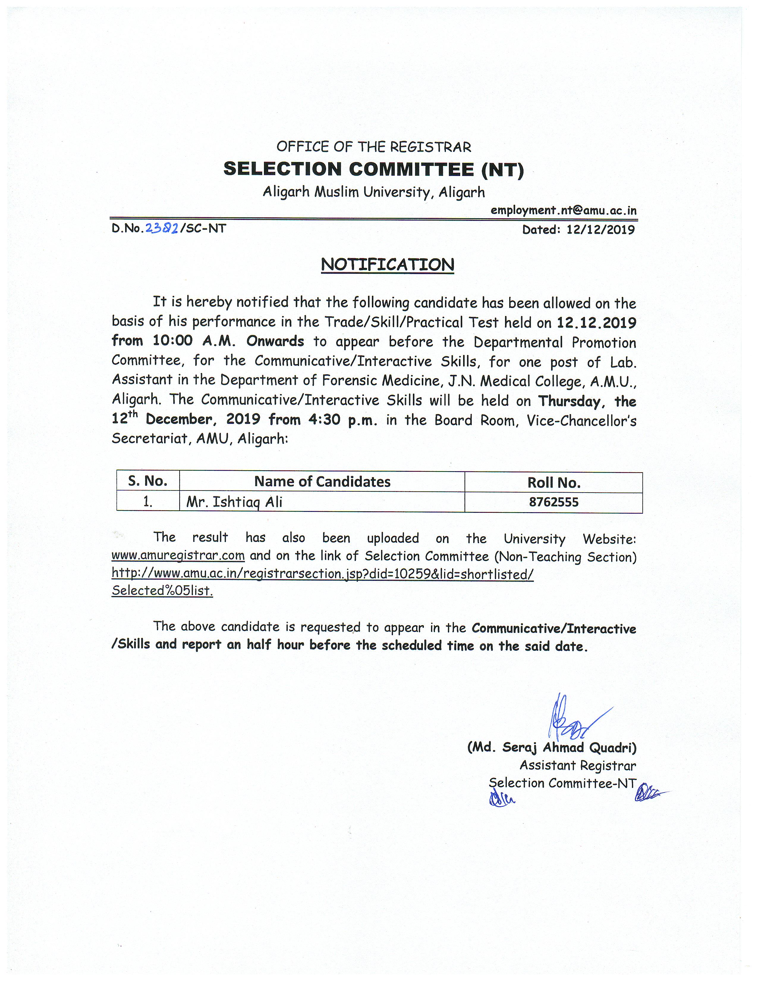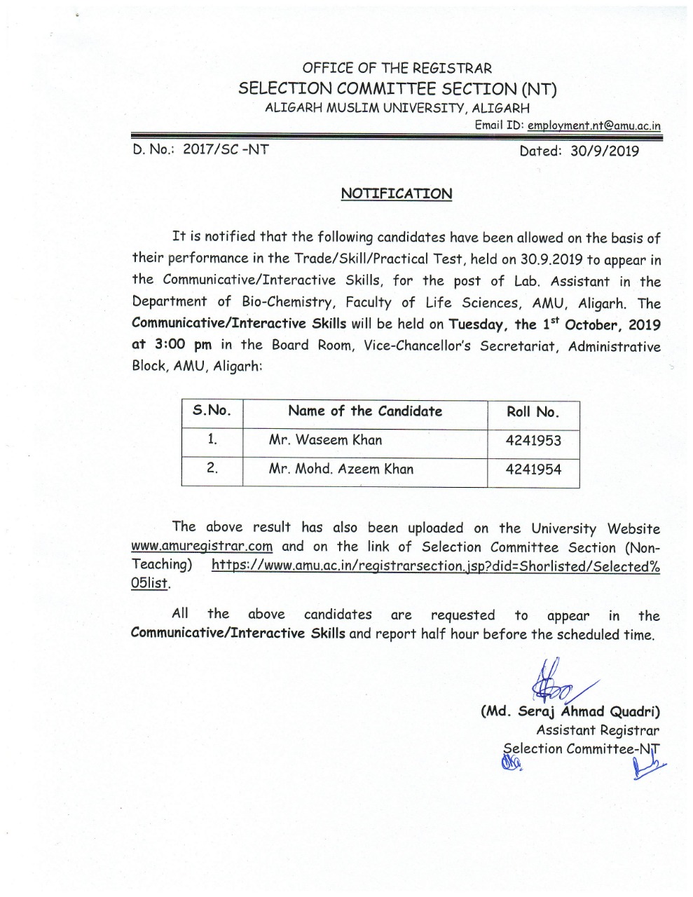 - Result of Trade/Skill/Practical Test for the post of Lab Assistant in the Department of Chemistry,AMU,Aligarh through DPC.