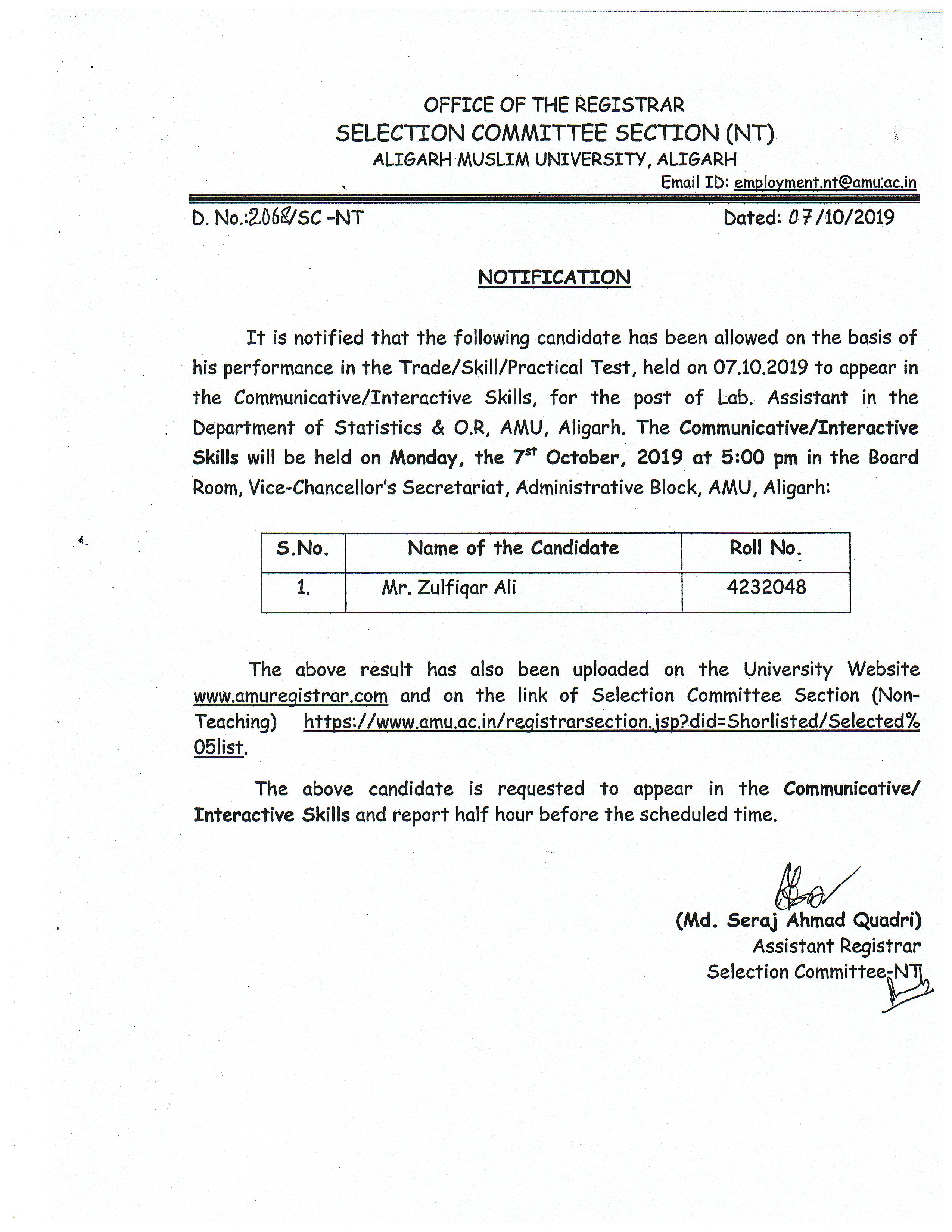 - Candidate Shortlisted for Lab. Assistant,Department Of Biochemistry,AMU,Aligarh