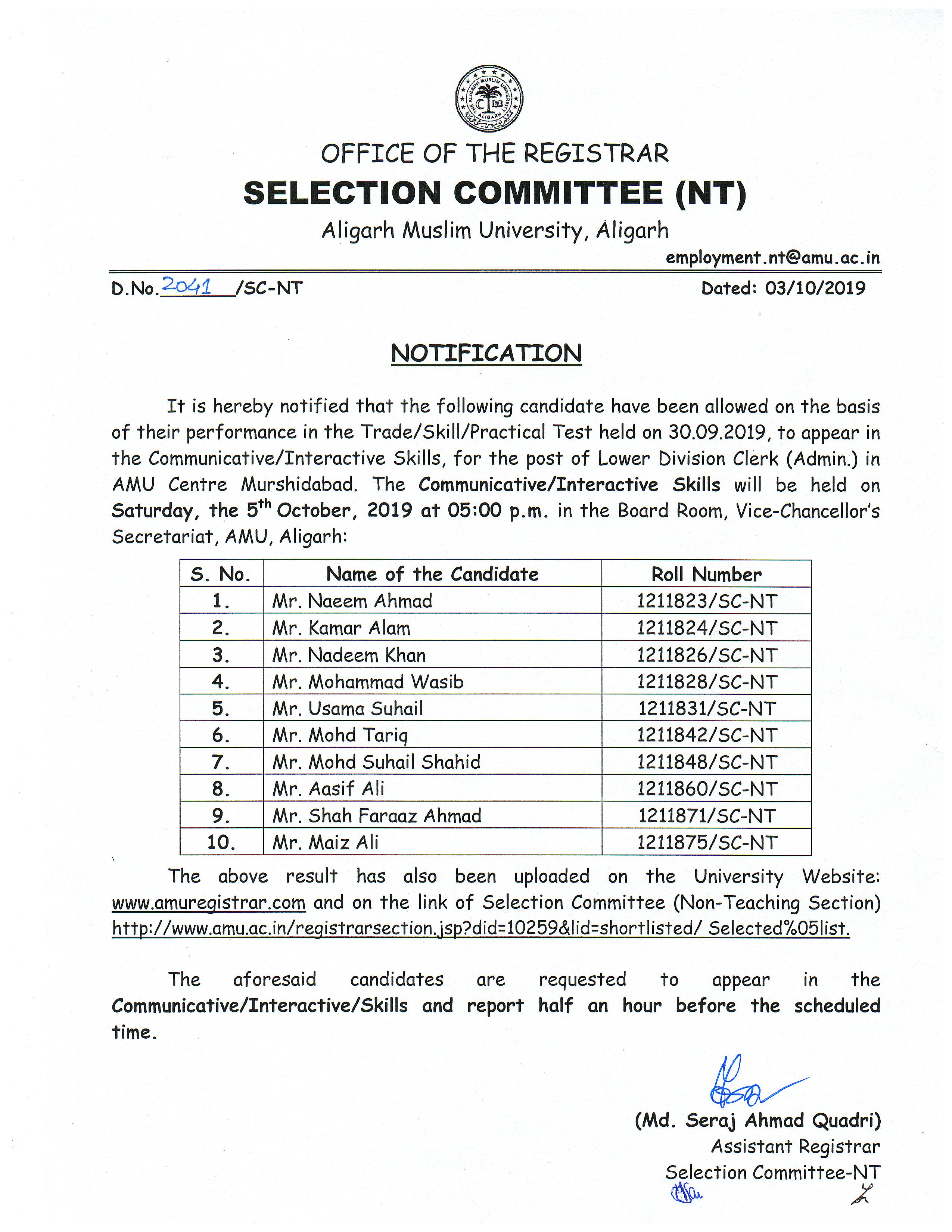 - Candidates Shortlisted for Assistant(Legal),Department of Properties & Waqfs,AMU,Aligarh
