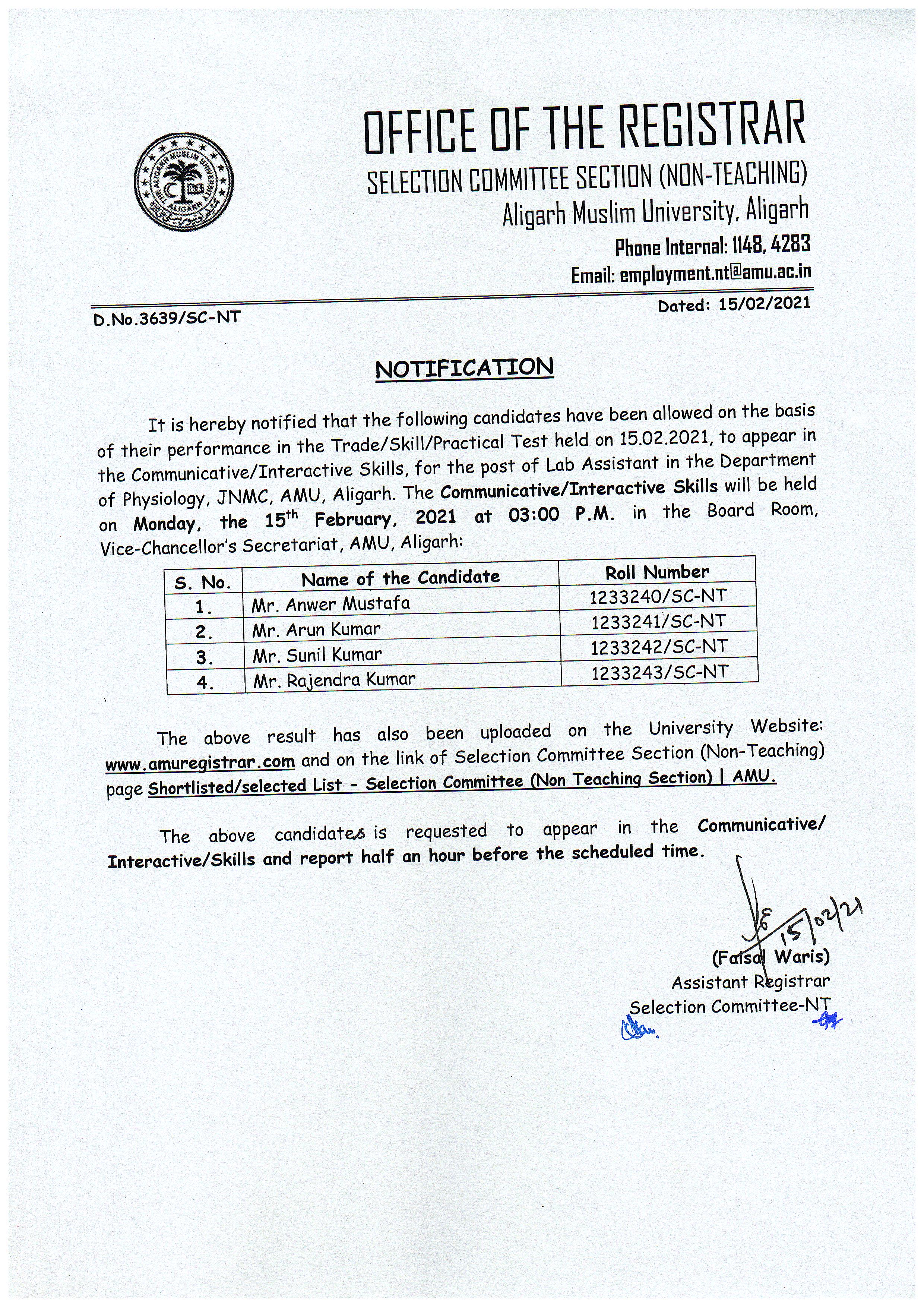 - Result of Trade/Skill/Practical Test for the post of Lab Assistant in the Department of Physiology,JNMC,AMU,Aligarh.