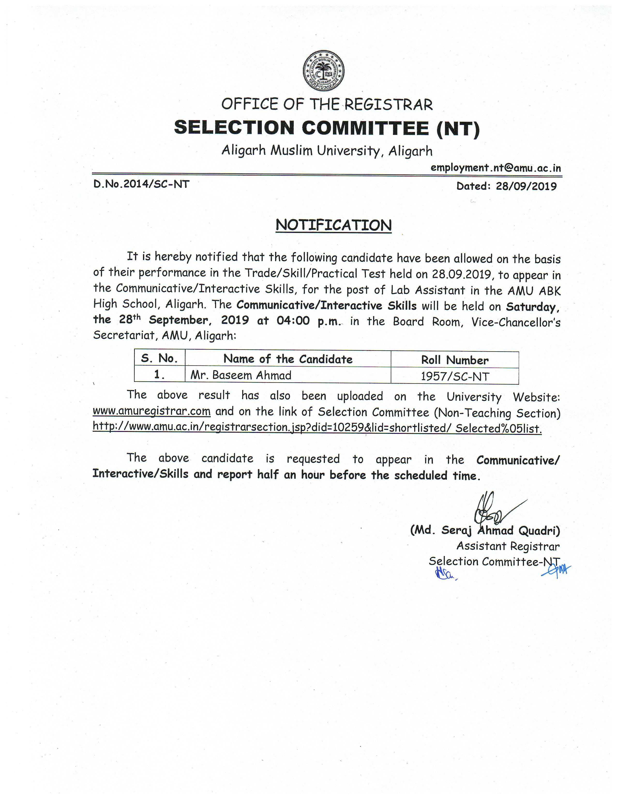 - Candidate Shortlisted for Lab. Assistant,AMU ABK High School,Aligarh