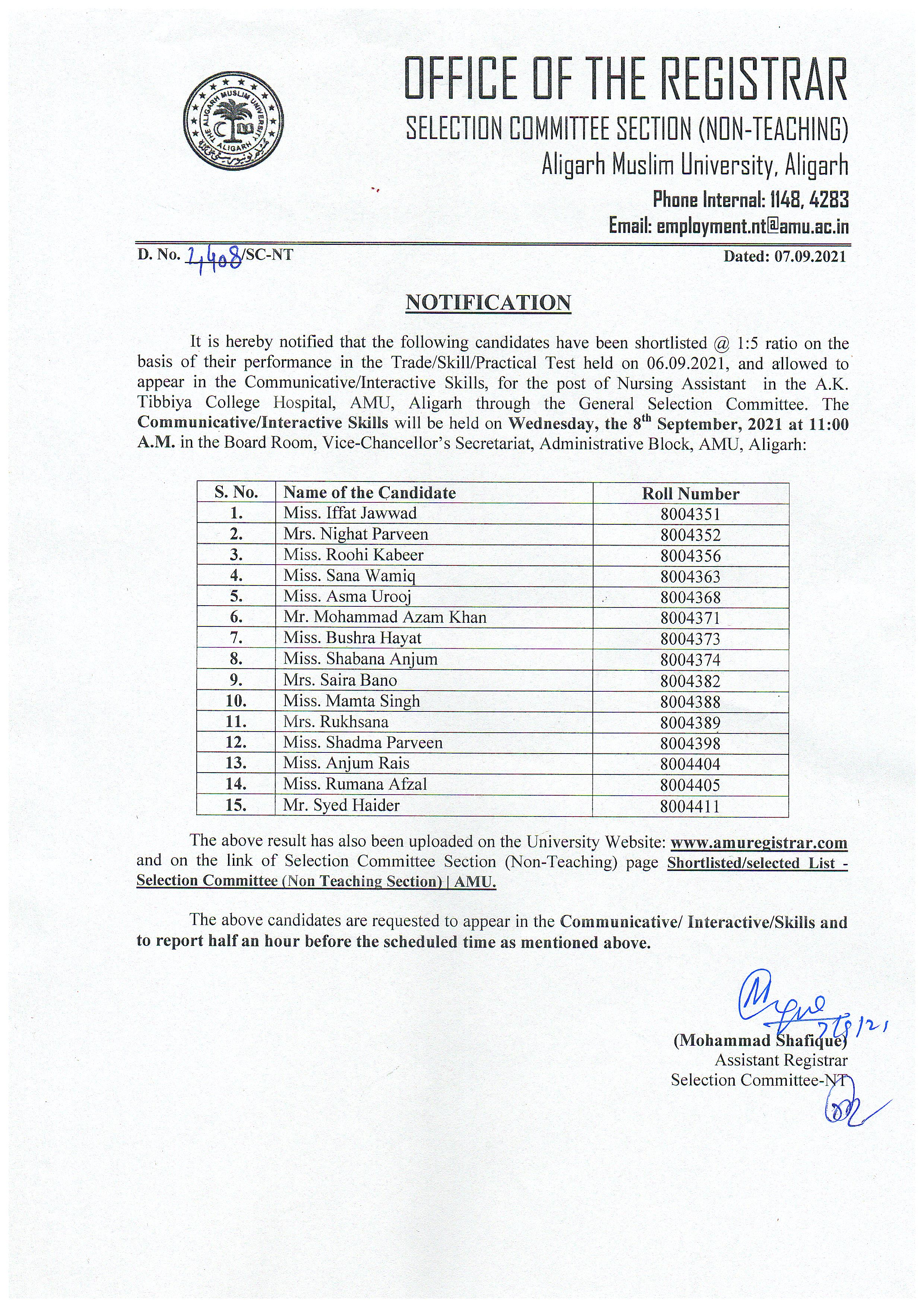 - Result of Trade/Skill/Practical Test for the post of Nursing Assistant in the A.K Tibbiya College Hospital,AMU,Aligarh through General Selection Committee.