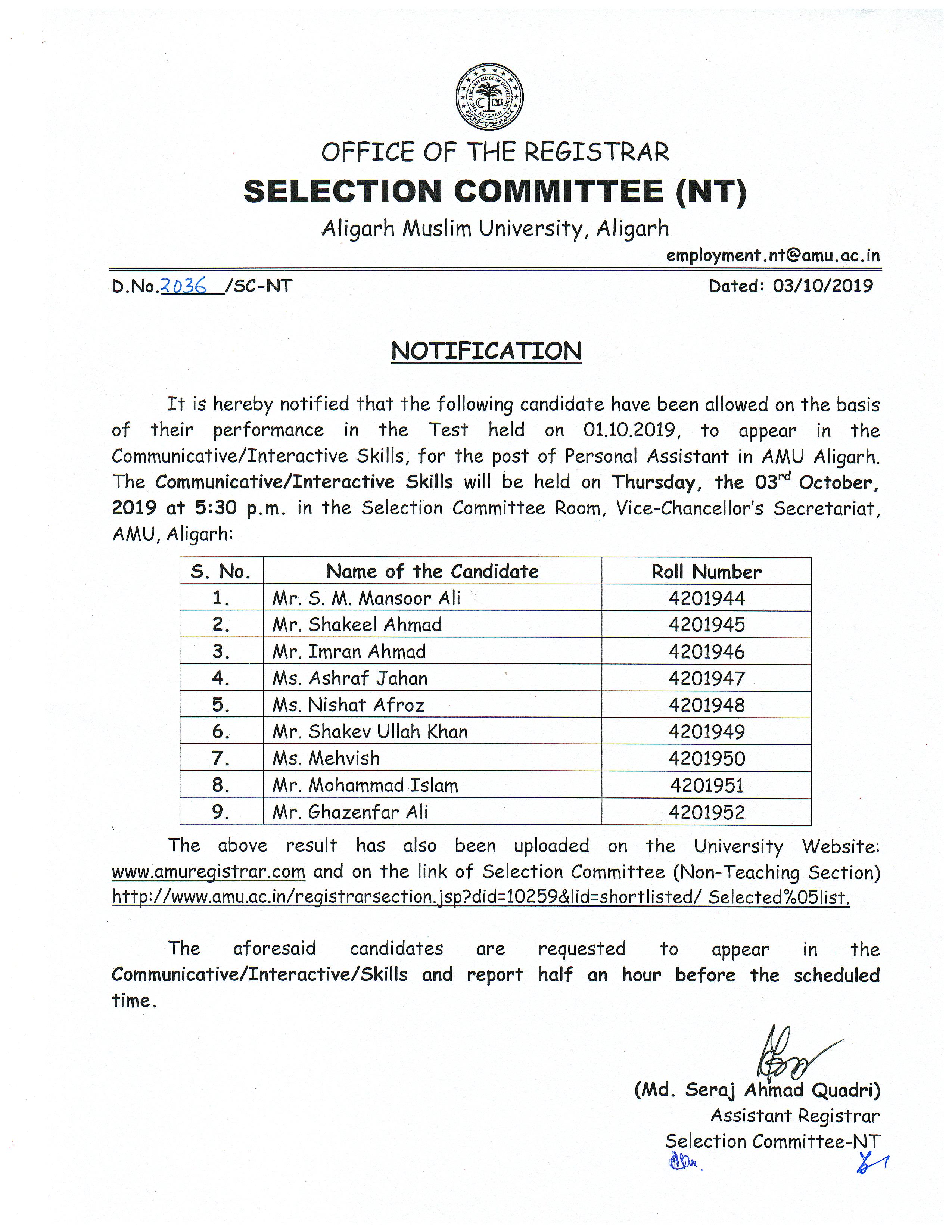 - Candidates Shortlisted for Personal Assistant in AMU,Aligarh