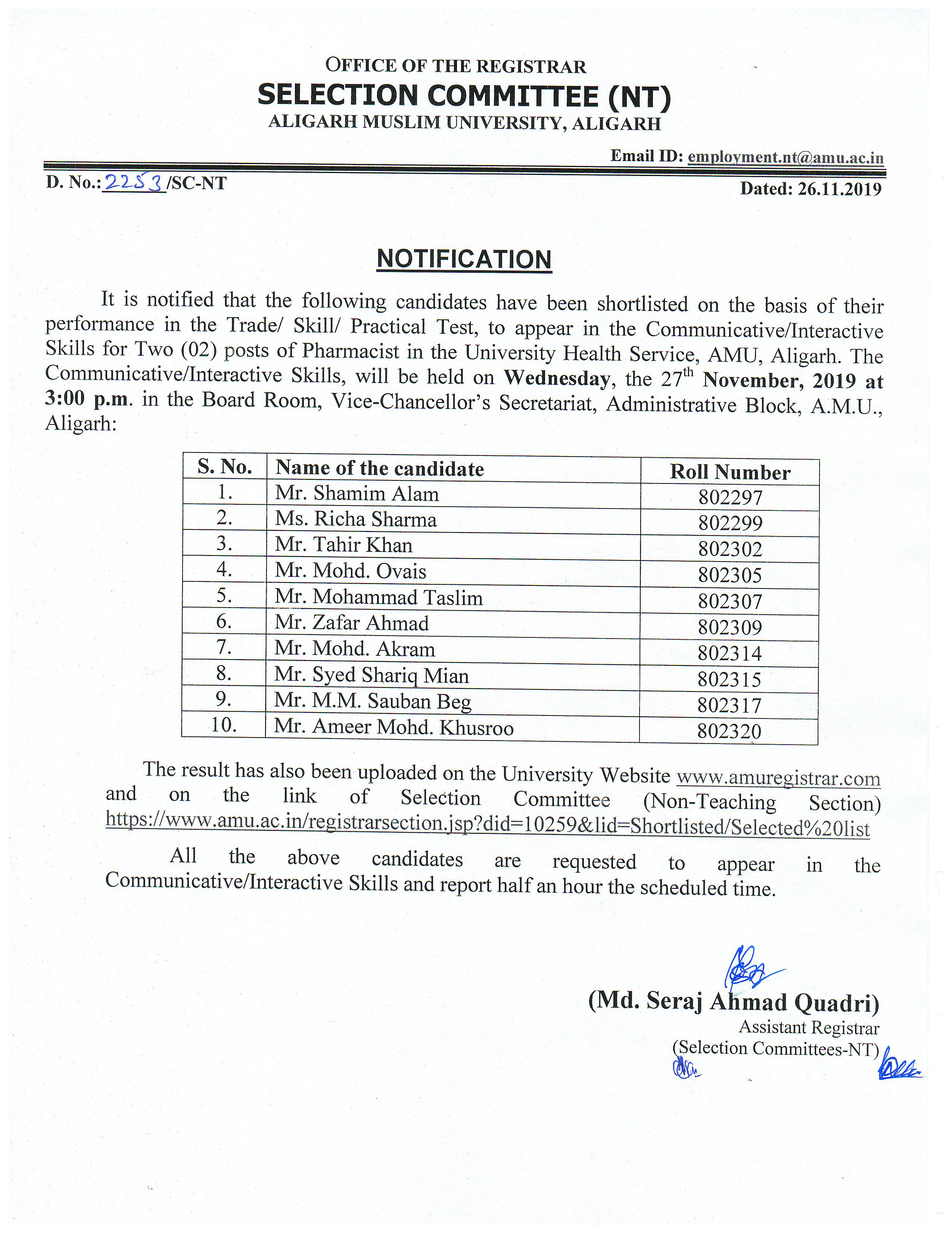 - Candidates Shortlisted for Pharmacist in the University Health Service,AMU Aligarh.