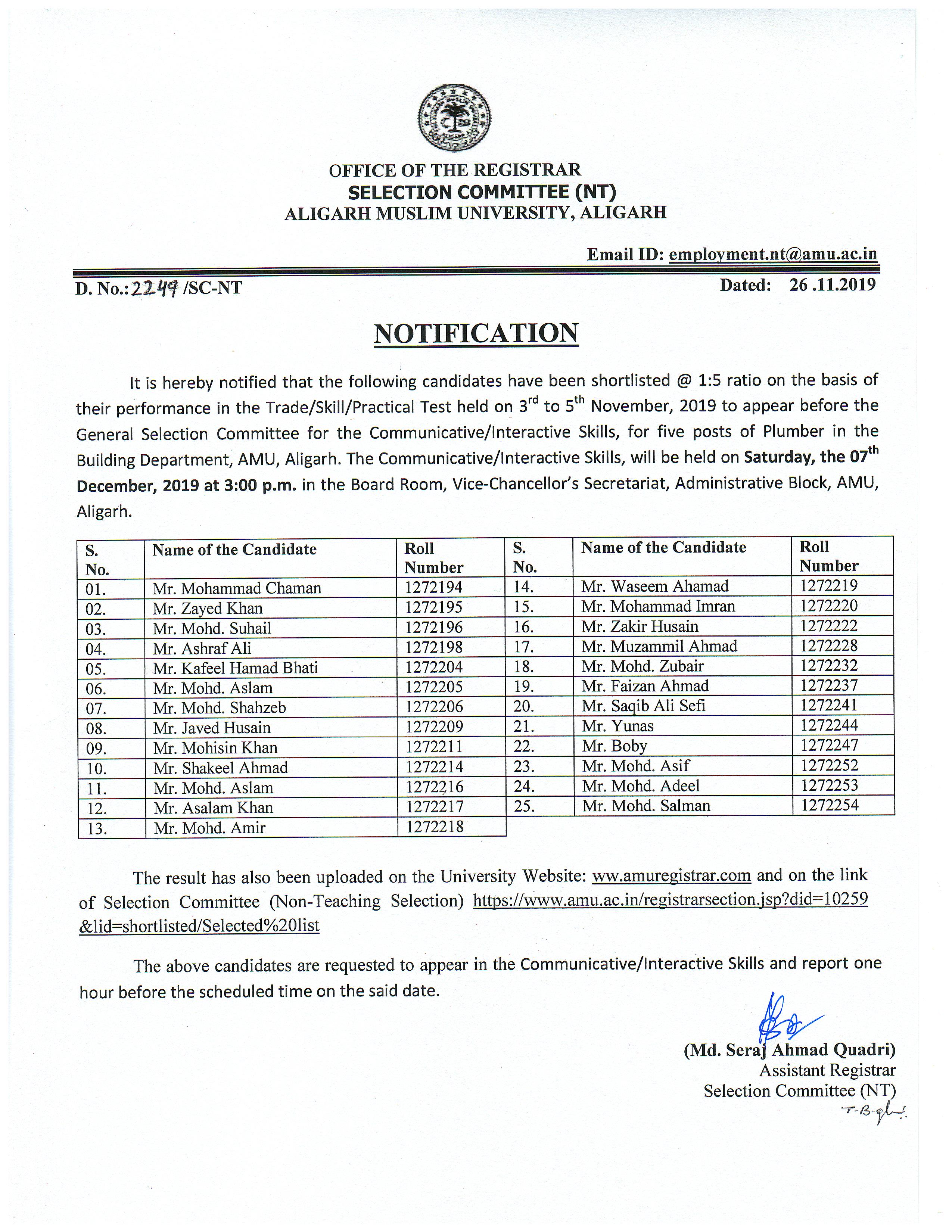 - Candidates Shortlisted for Plumber in the Building Department,AMU Aligarh.