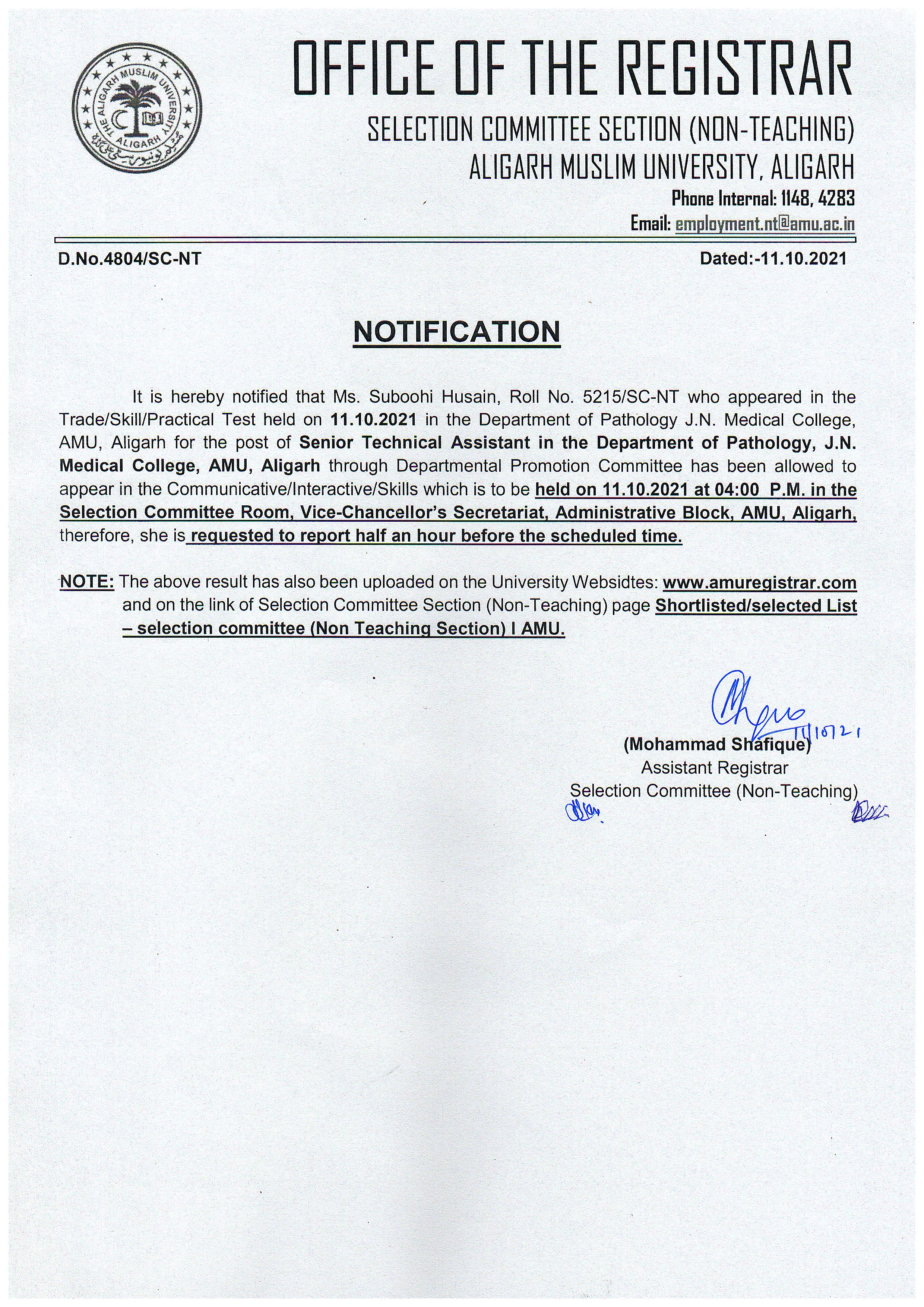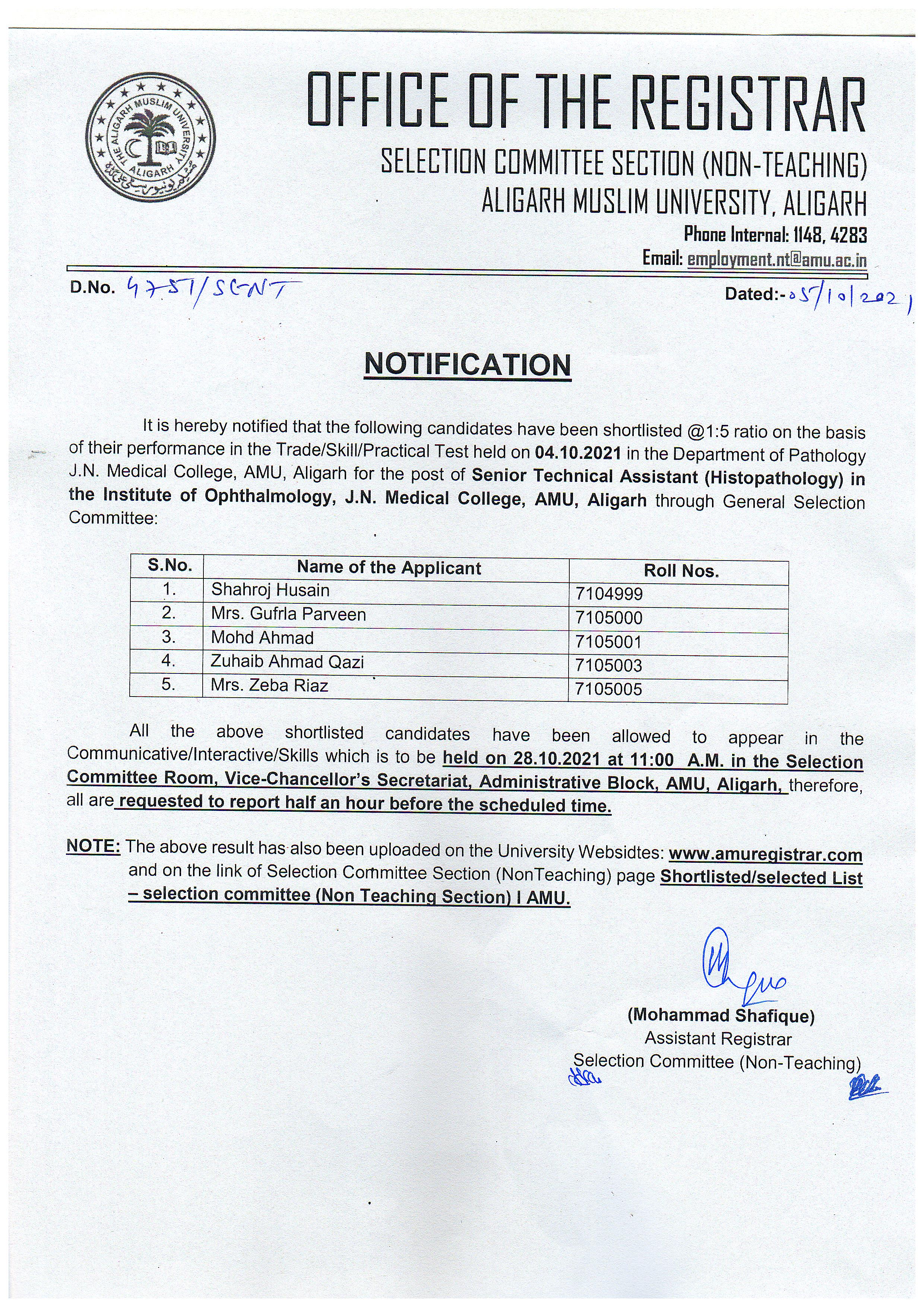 - Result of Trade/Skill/Practical Test for the post of Senior Technical Assistant in the Department of Pathology,JNMC,AMU,Aligarh through Departmental Promotion Committee.