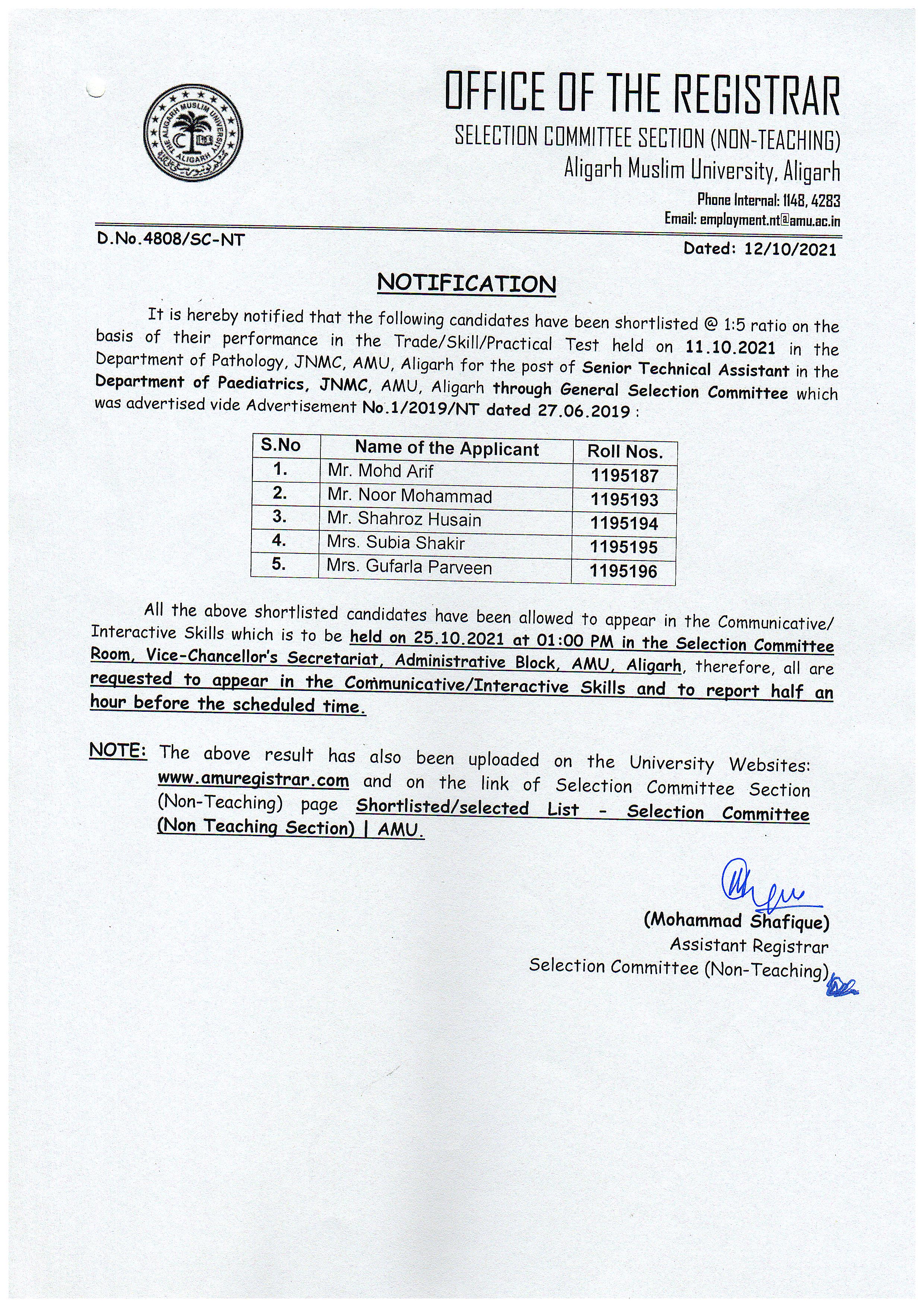 - Result of Trade/Skill/Practical Test for the post of Senior Technical Assistant in the Department of Paediatrics,JNMC,AMU,Aligarh through General Selection Committee.