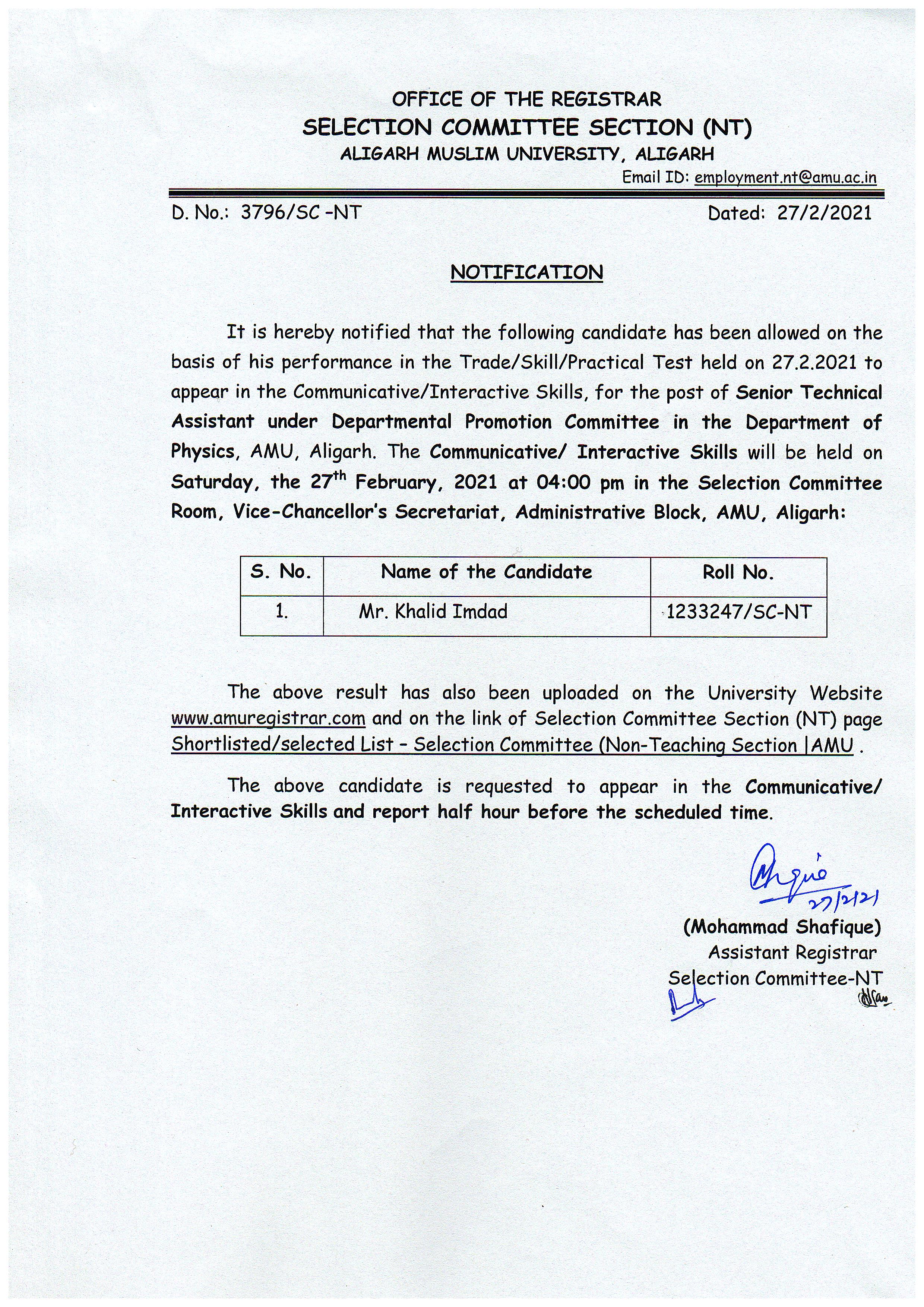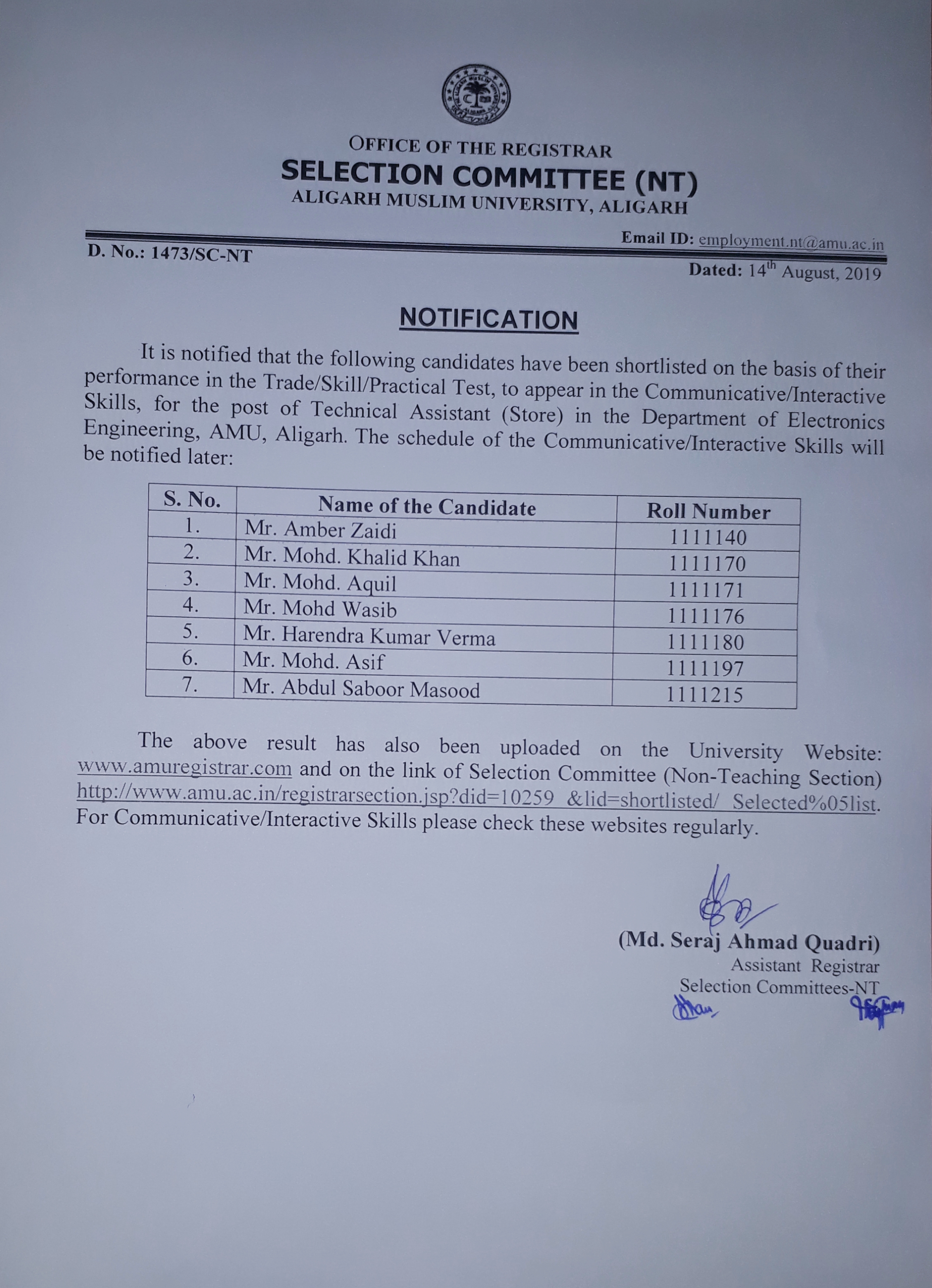 - Result of Trade/Skill/Practical Test for the post of Senior Technical Assistant in the University Sophisticated Instruments Facility,AMU Aligarh through General Selection Committee.