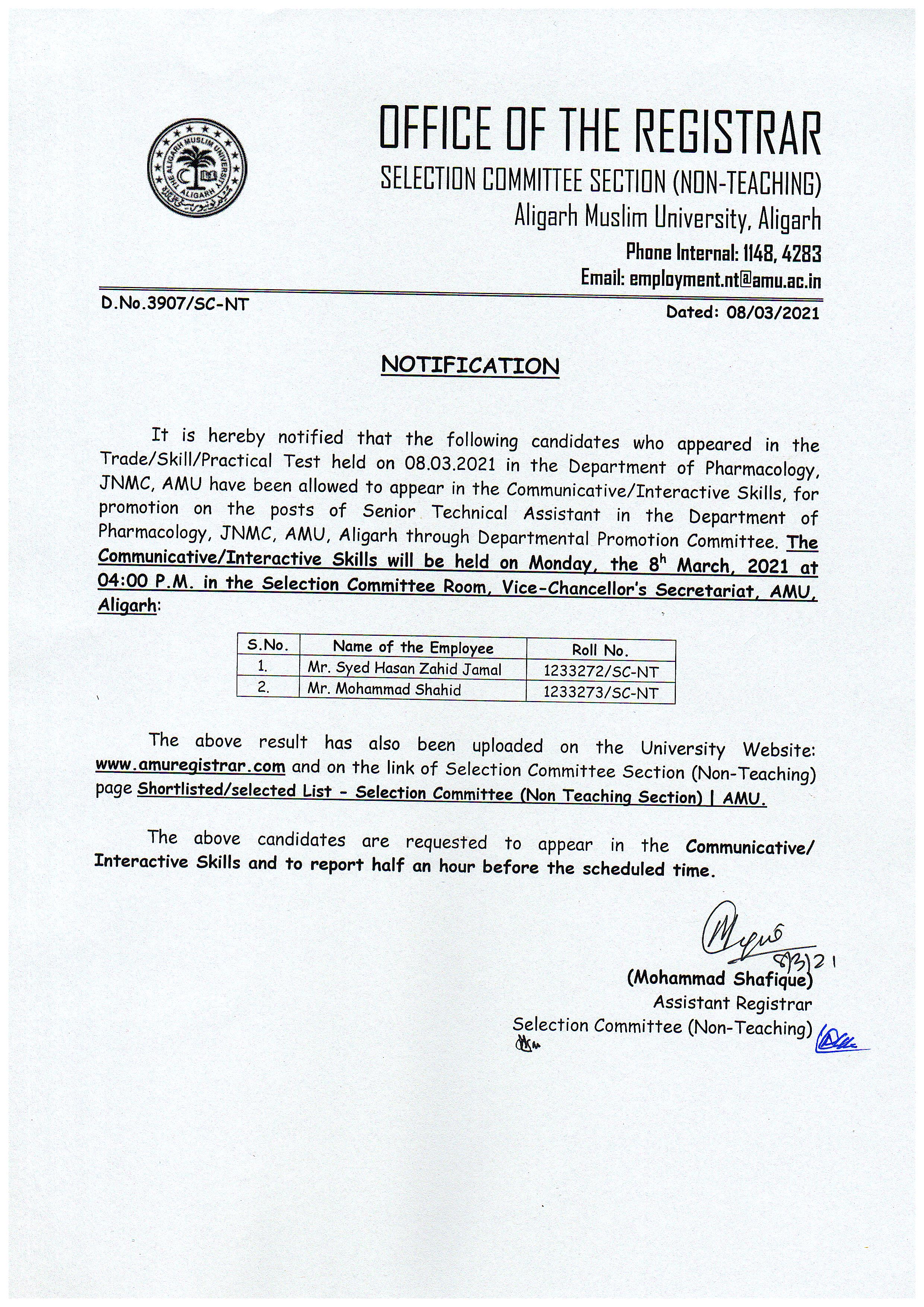 - Result of Trade/Skill/Practical Test for the post of Senior Technical Assistant in the Department of Pharmacology,JNMC,AMU Aligarh through DPC