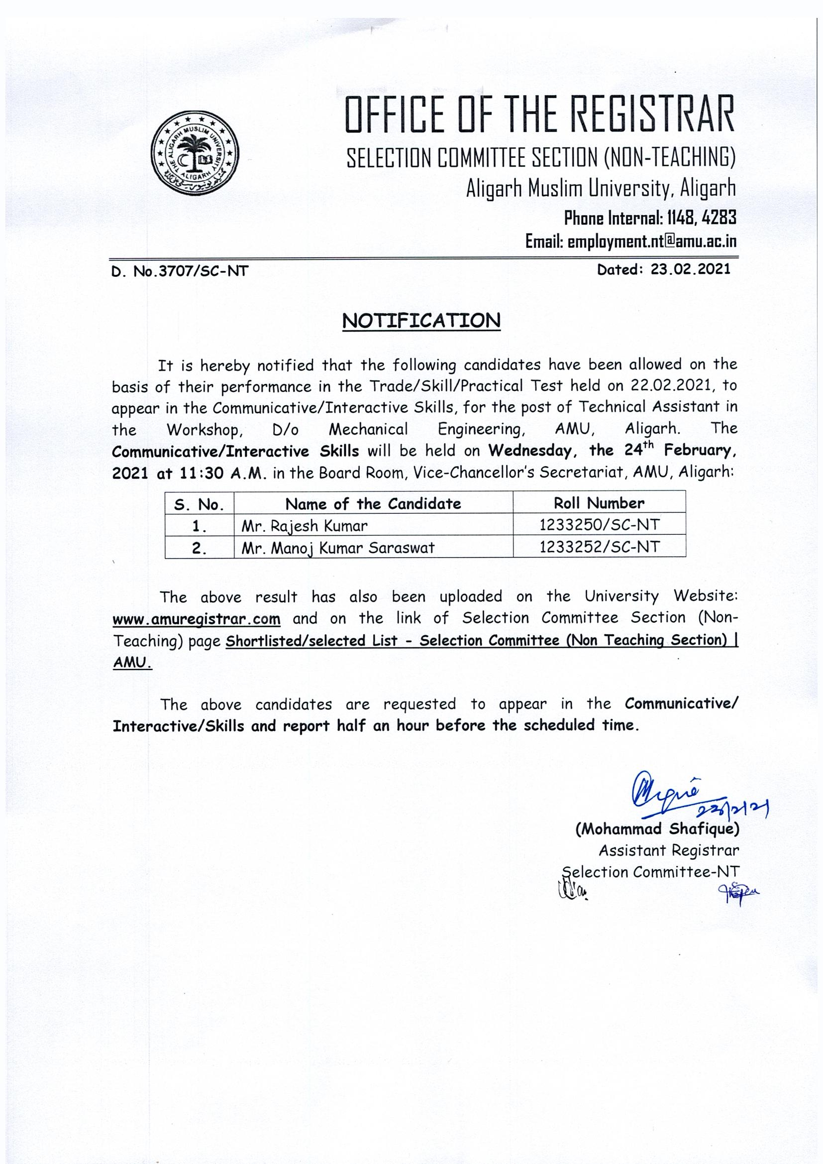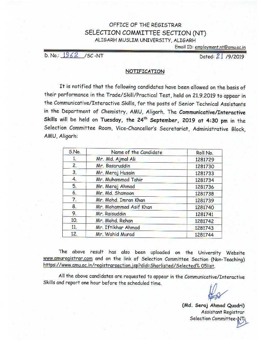- Candidates Shortlisted for Senior Technical Assistants,Department of Chemistry,AMU,Aligarh