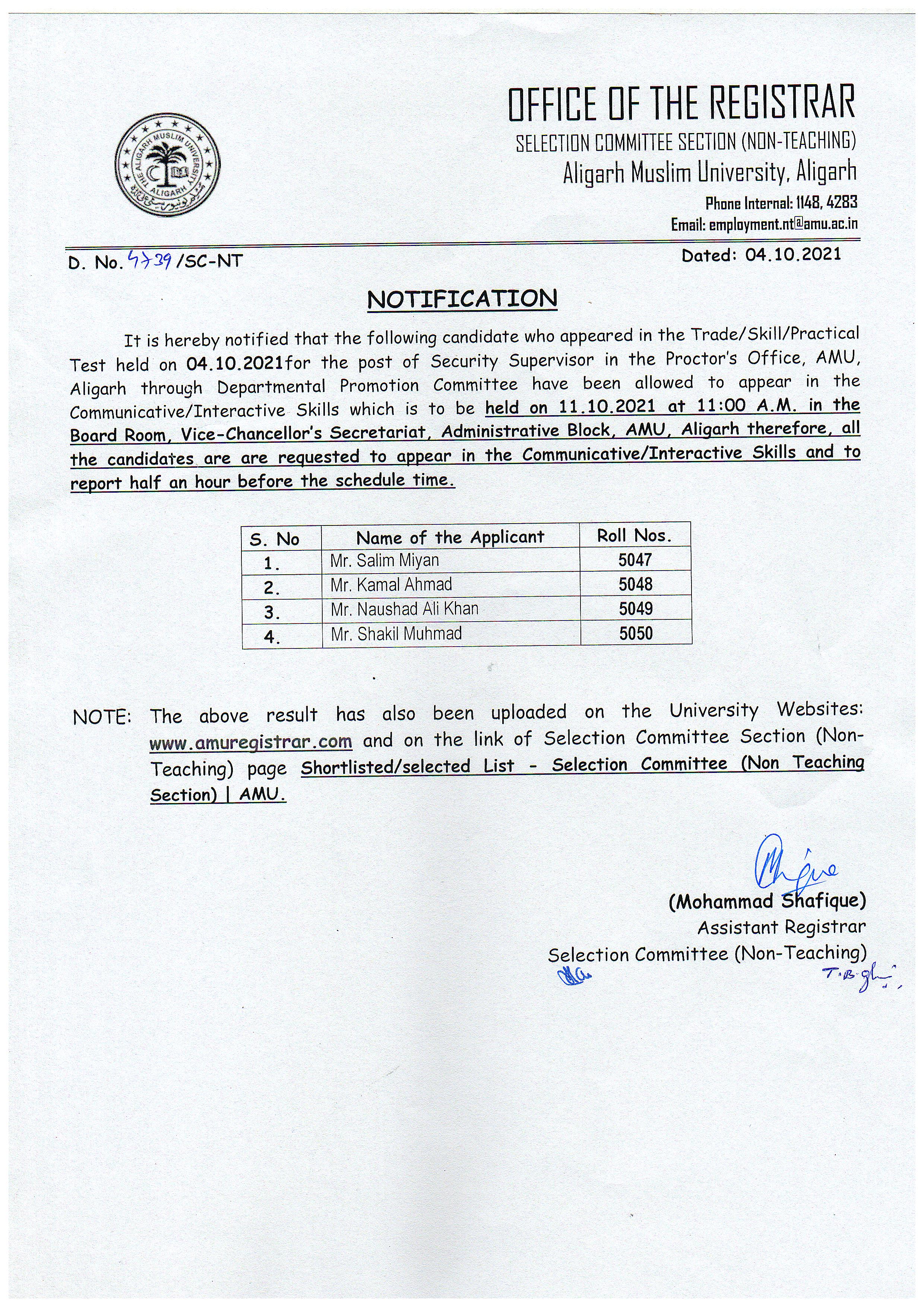- Result of Trade/Skill/Practical Test for the post of Security Supervisor in the Proctor's Office , AMU,Aligarh through Departmental Promotion Committee.