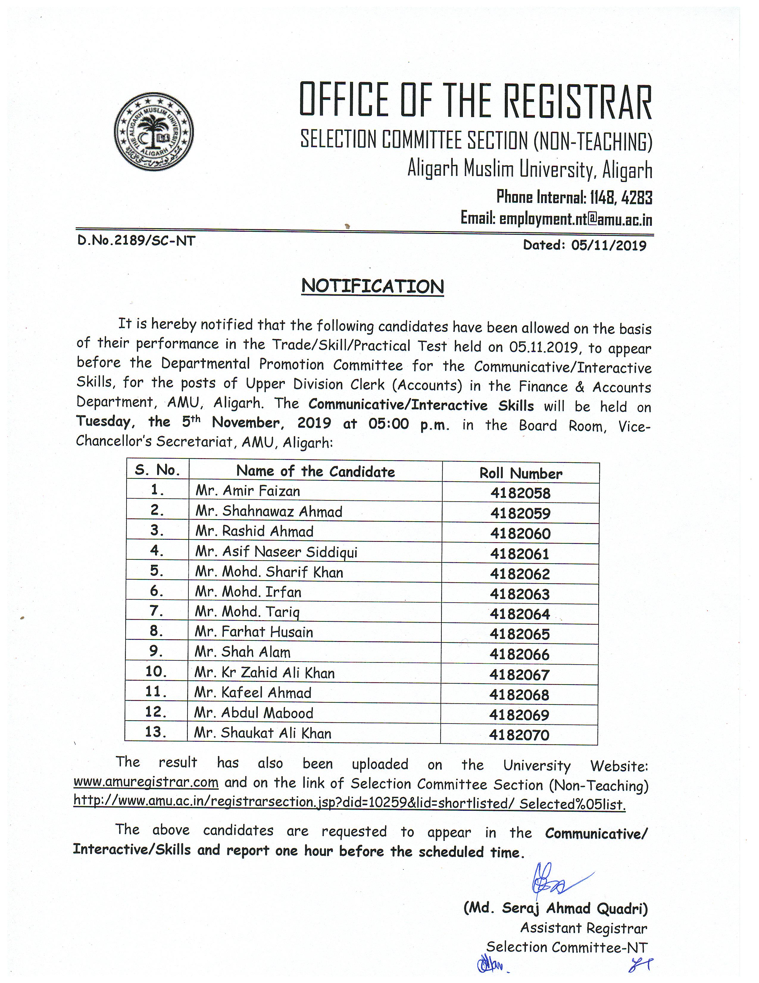 - Result of Trade/Skill/Practical Test for the post of Upper Division Clerk(Admin) in the Aligarh Muslim University ,Aligarh through Departmental Promotion Committee.