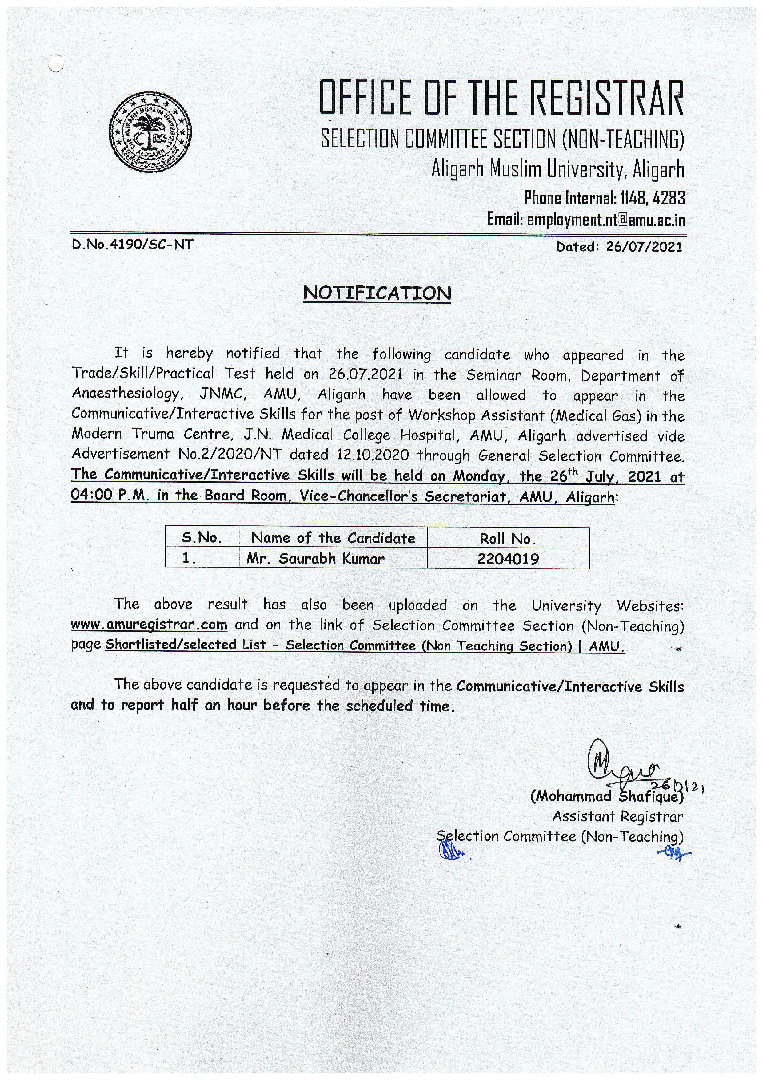 - Result of Trade/Skill/Practical Test for the post of Workshop Assistant(Medical Gas),Modern Trauma Centre,J N Medical College Hospital,AMU Aligarh.